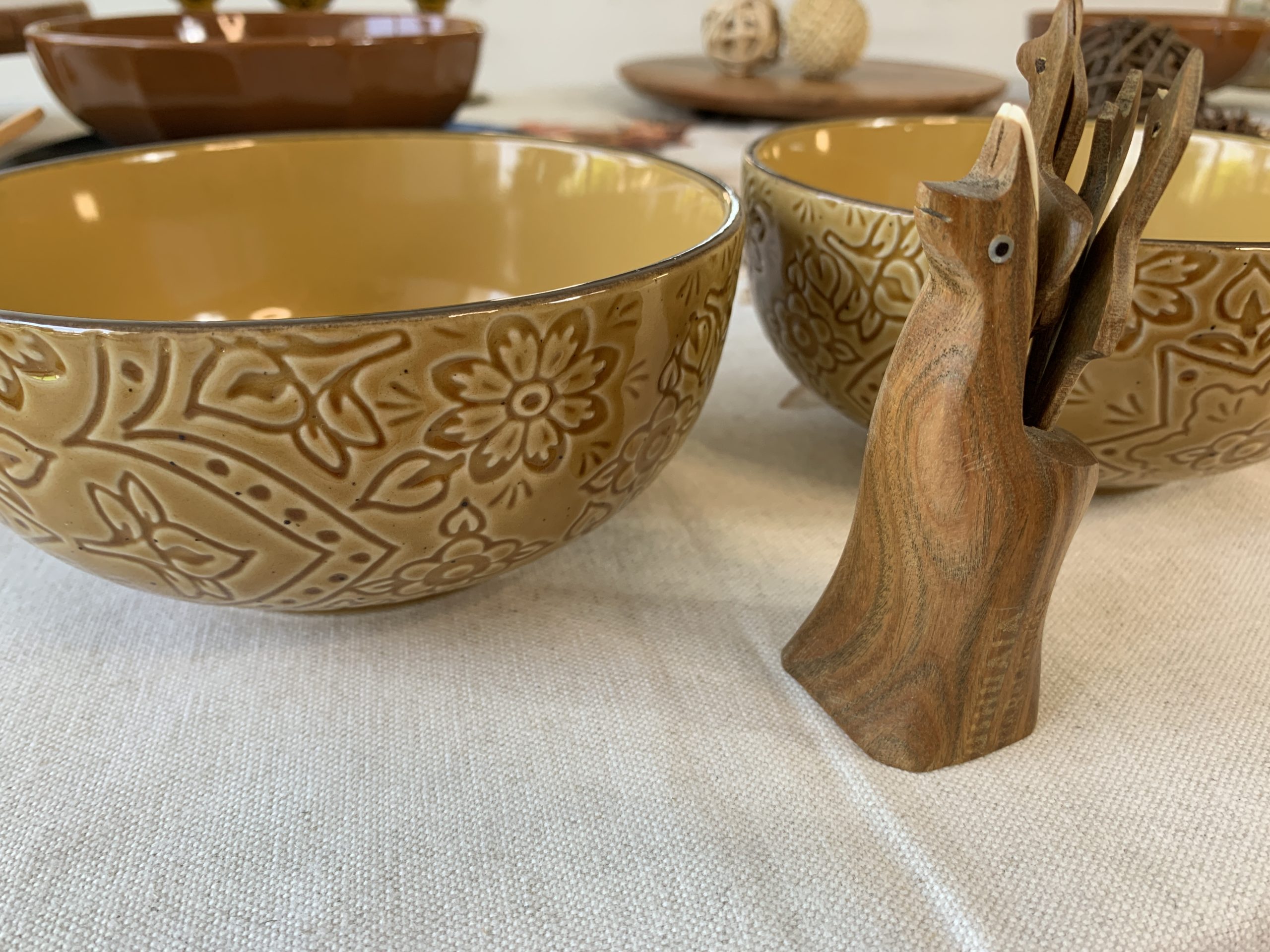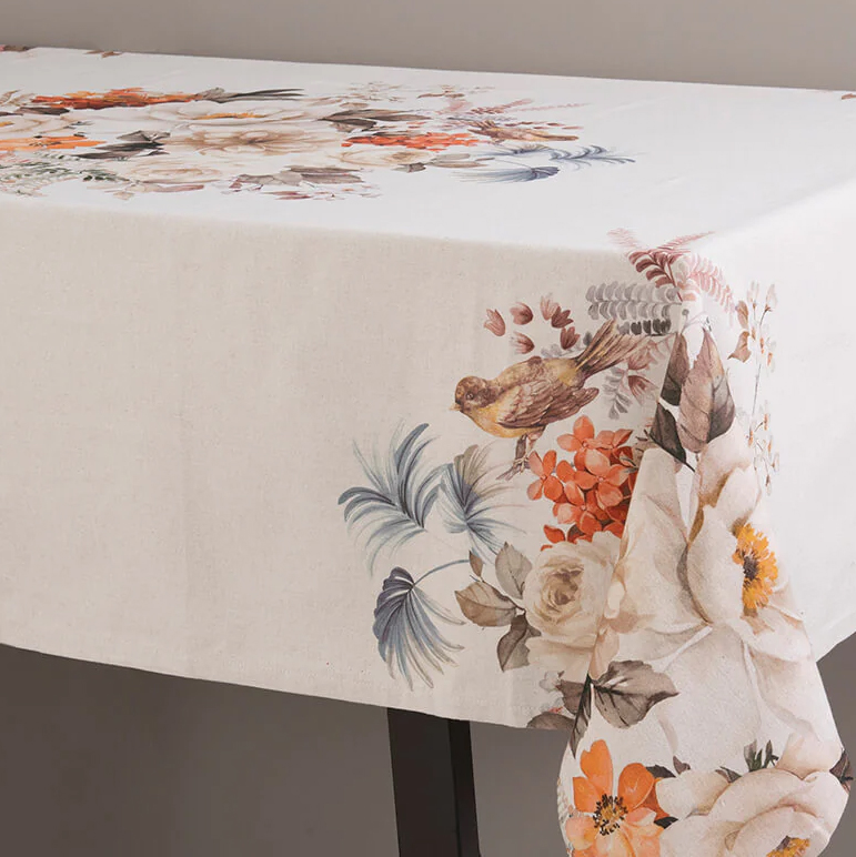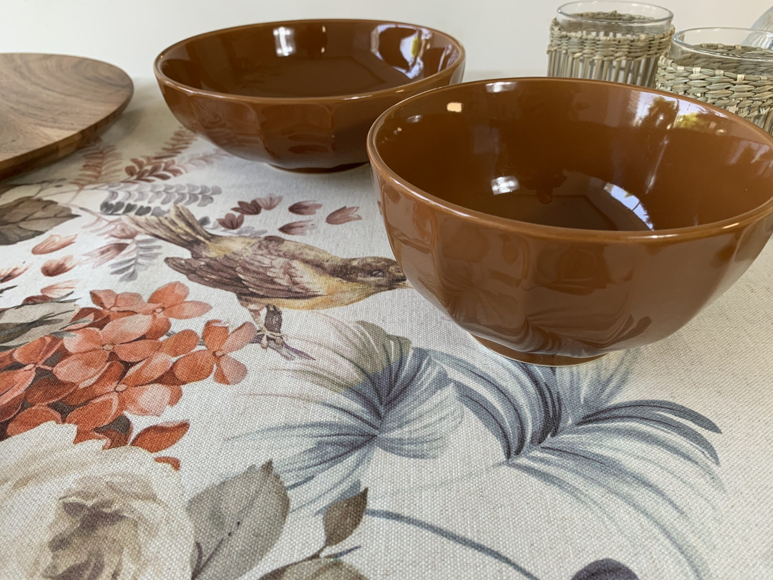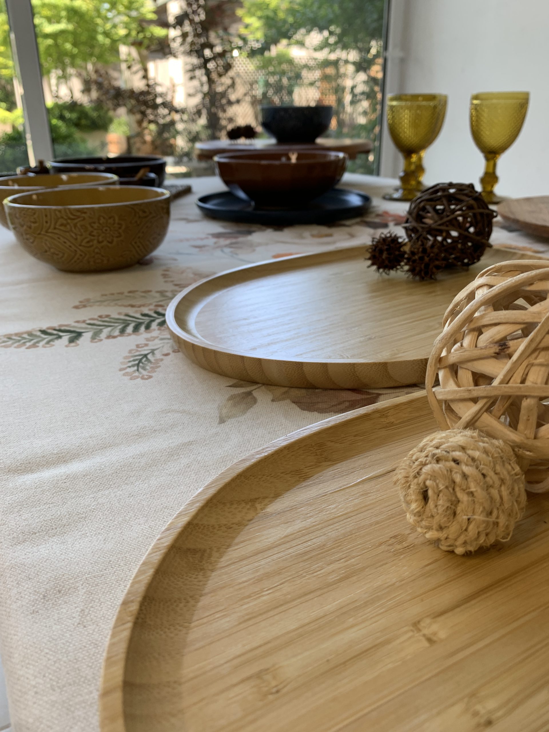Una versión igual de elegante, pero con mayor CALIDEZ, sumando a los tonos marrones tonalidades amarillas y objetos de madera y ratán. Maderas en varios tonos, fibras naturales y colores tierras que resaltan la idea OTOÑAL que refleja el estampado del mantel.