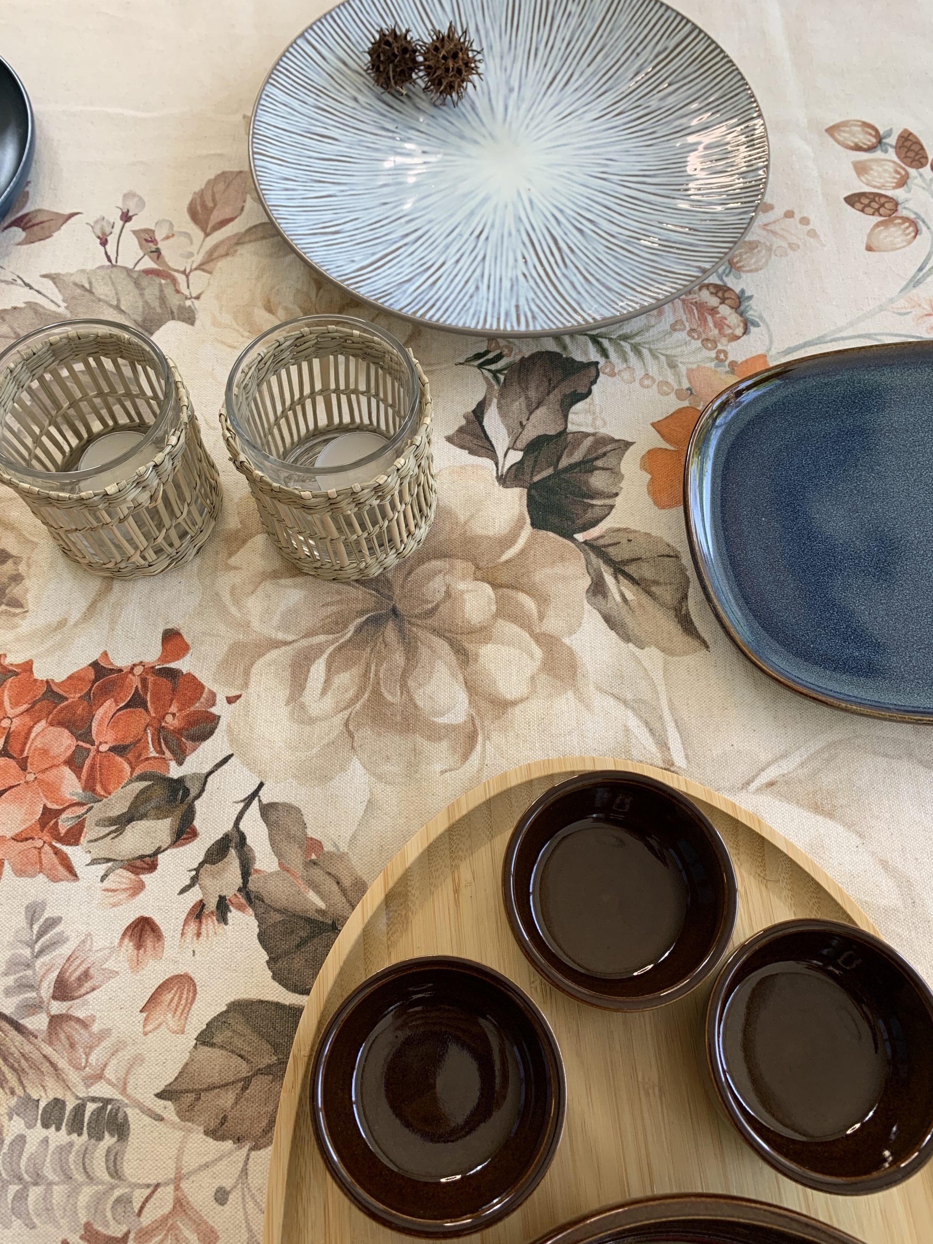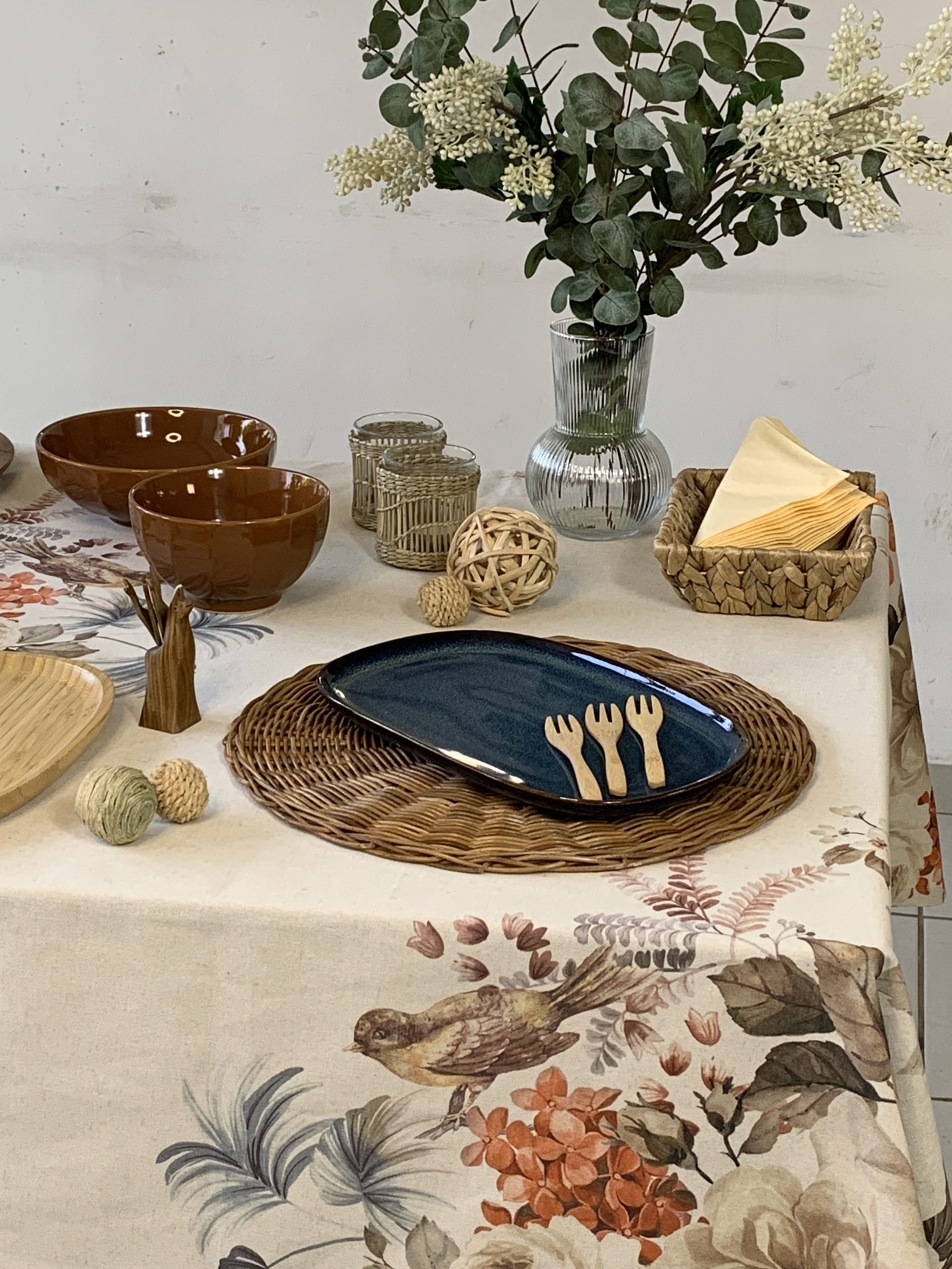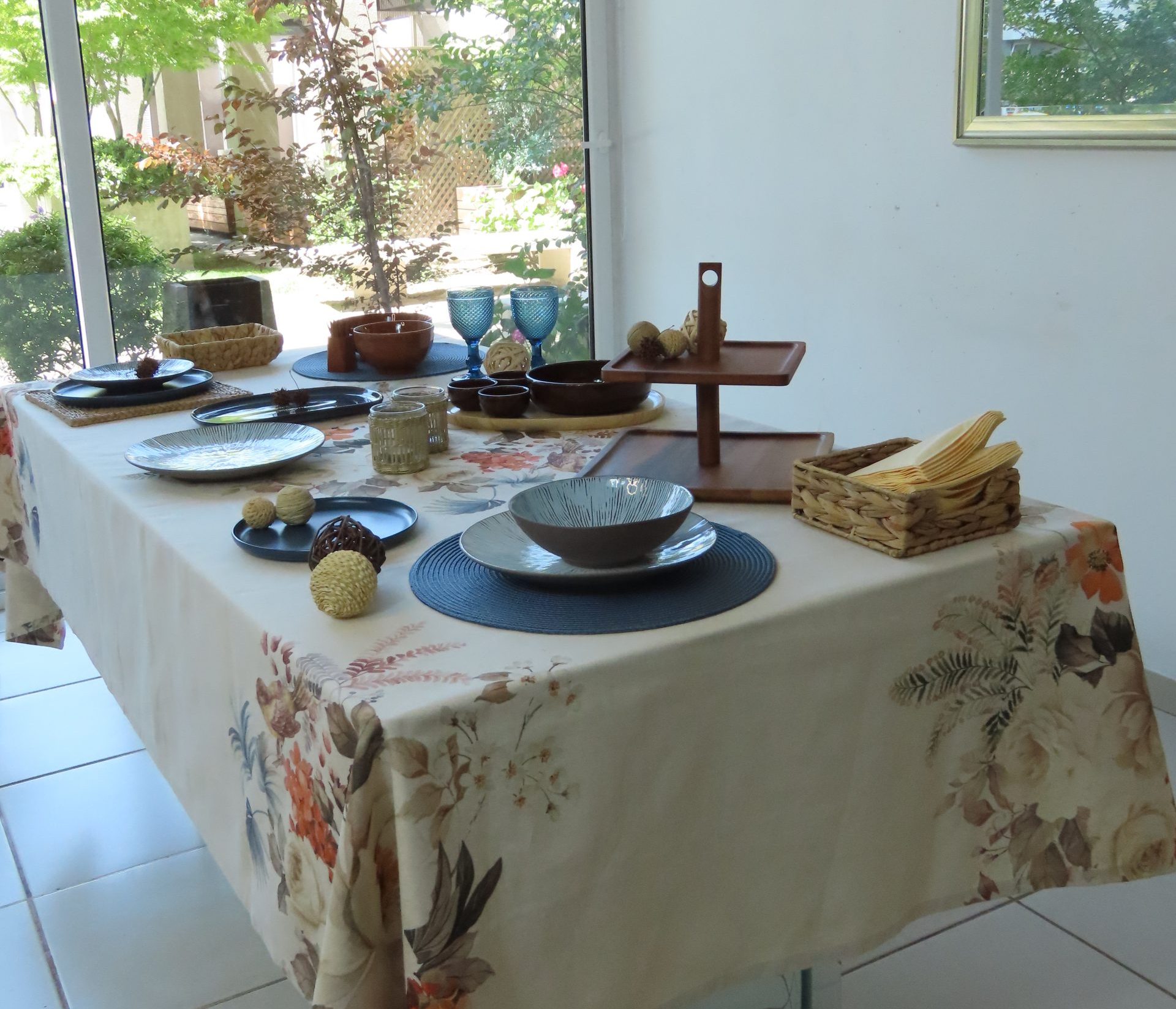 De apariencia elegante y SERENA, esta propuesta con los tonos marrones y azules brinda una sensación cálida y ACOGEDORA. Hemos elegido alrededor de 18 elementos que completan piezas de CERÁMICA, madera y fibras naturales. Esta bella opción se conforma a partir de un mantel de lino y algodón estampado de 150x250cm.