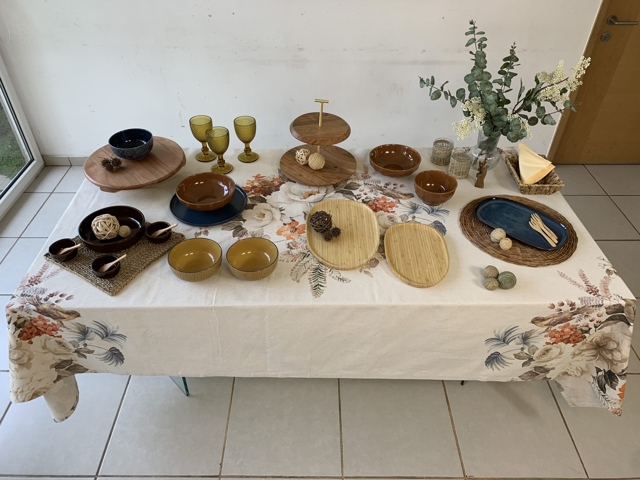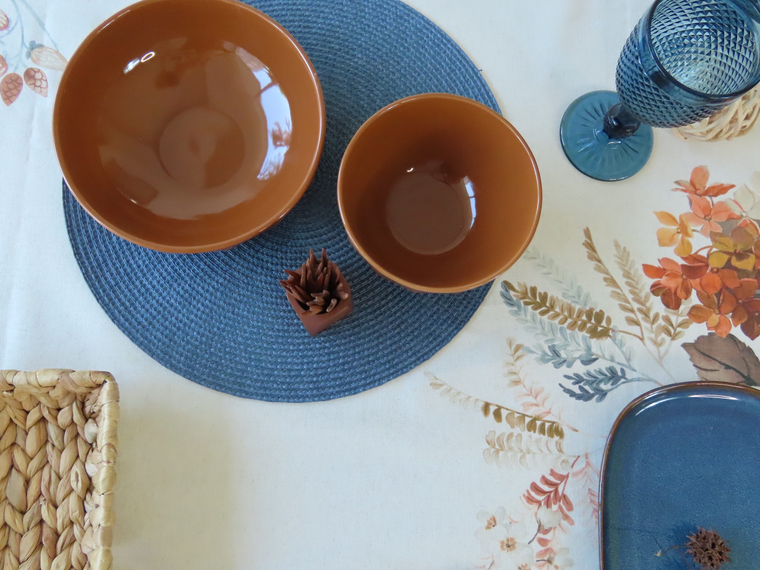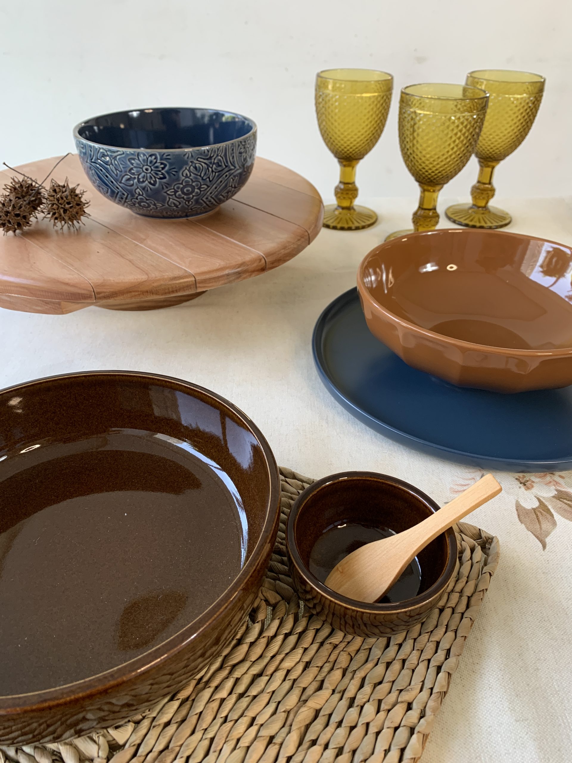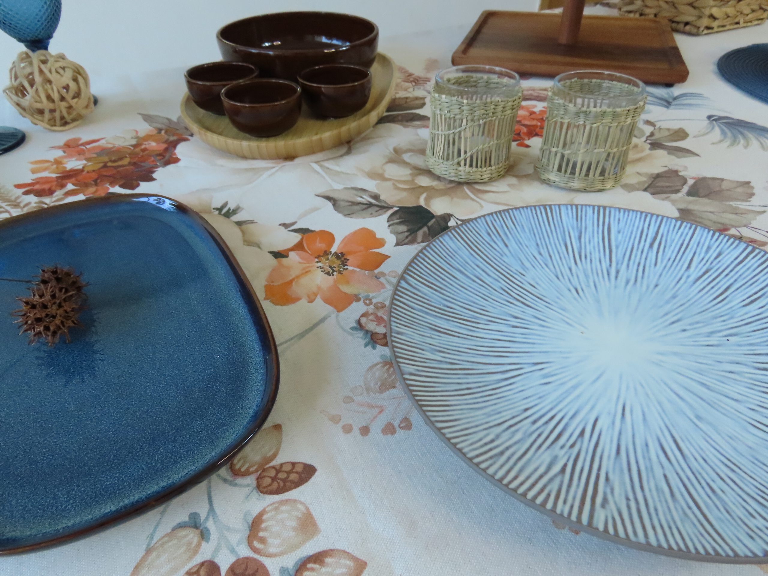 De apariencia elegante y SERENA, esta propuesta con los tonos marrones y azules brinda una sensación cálida y ACOGEDORA. Hemos elegido alrededor de 18 elementos que completan piezas de CERÁMICA, madera y fibras naturales. Esta bella opción se conforma a partir de un mantel de lino y algodón estampado de 150x250cm.