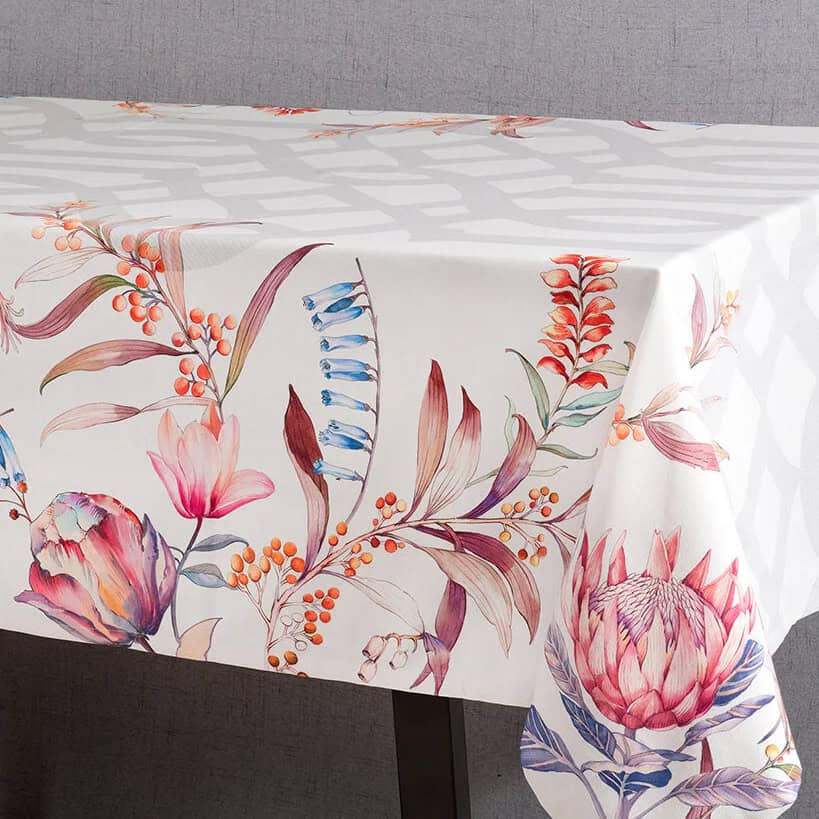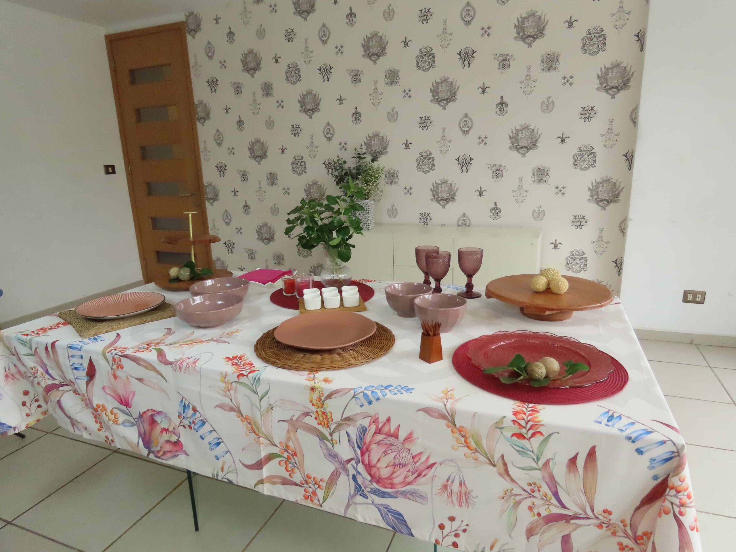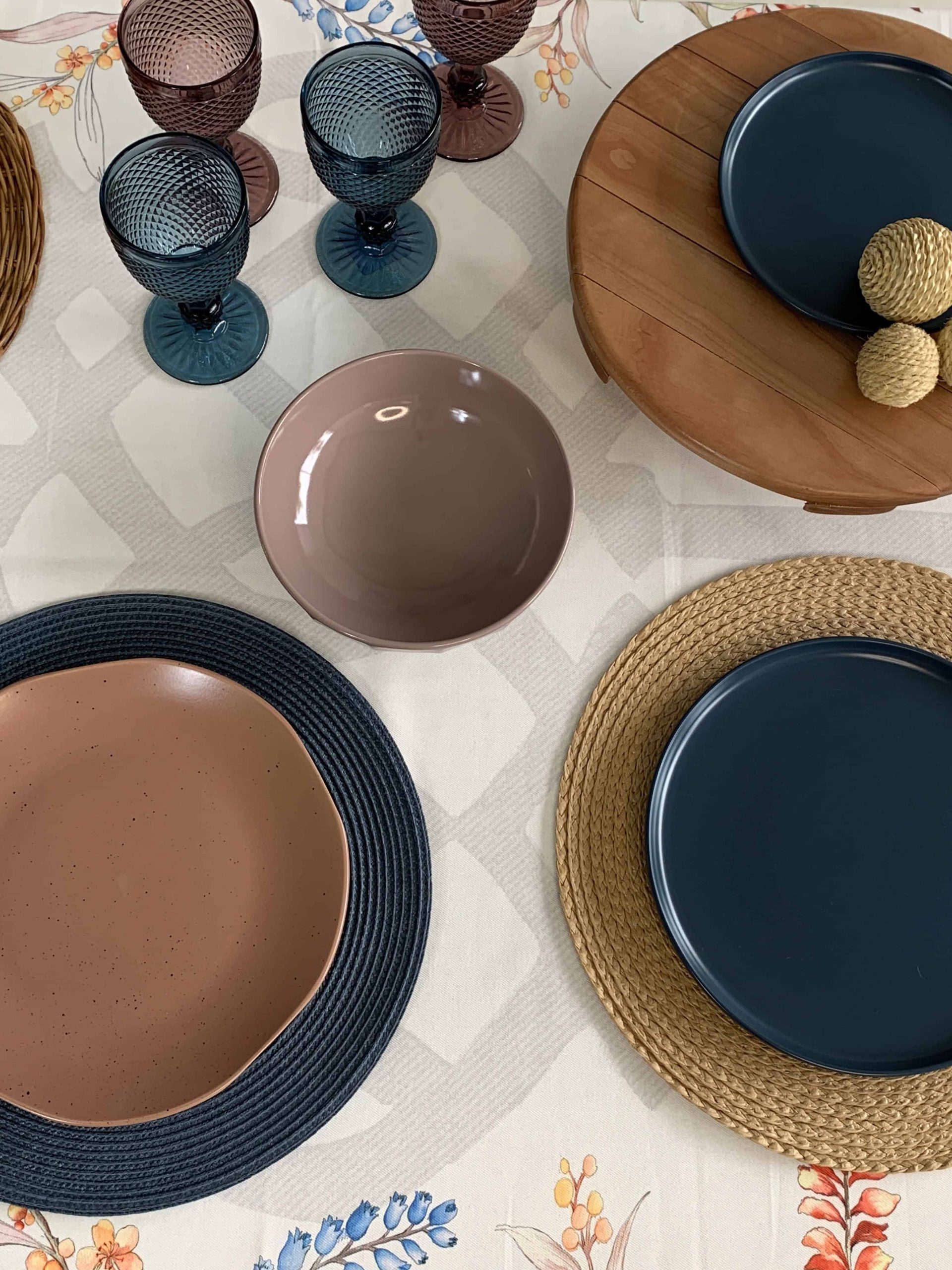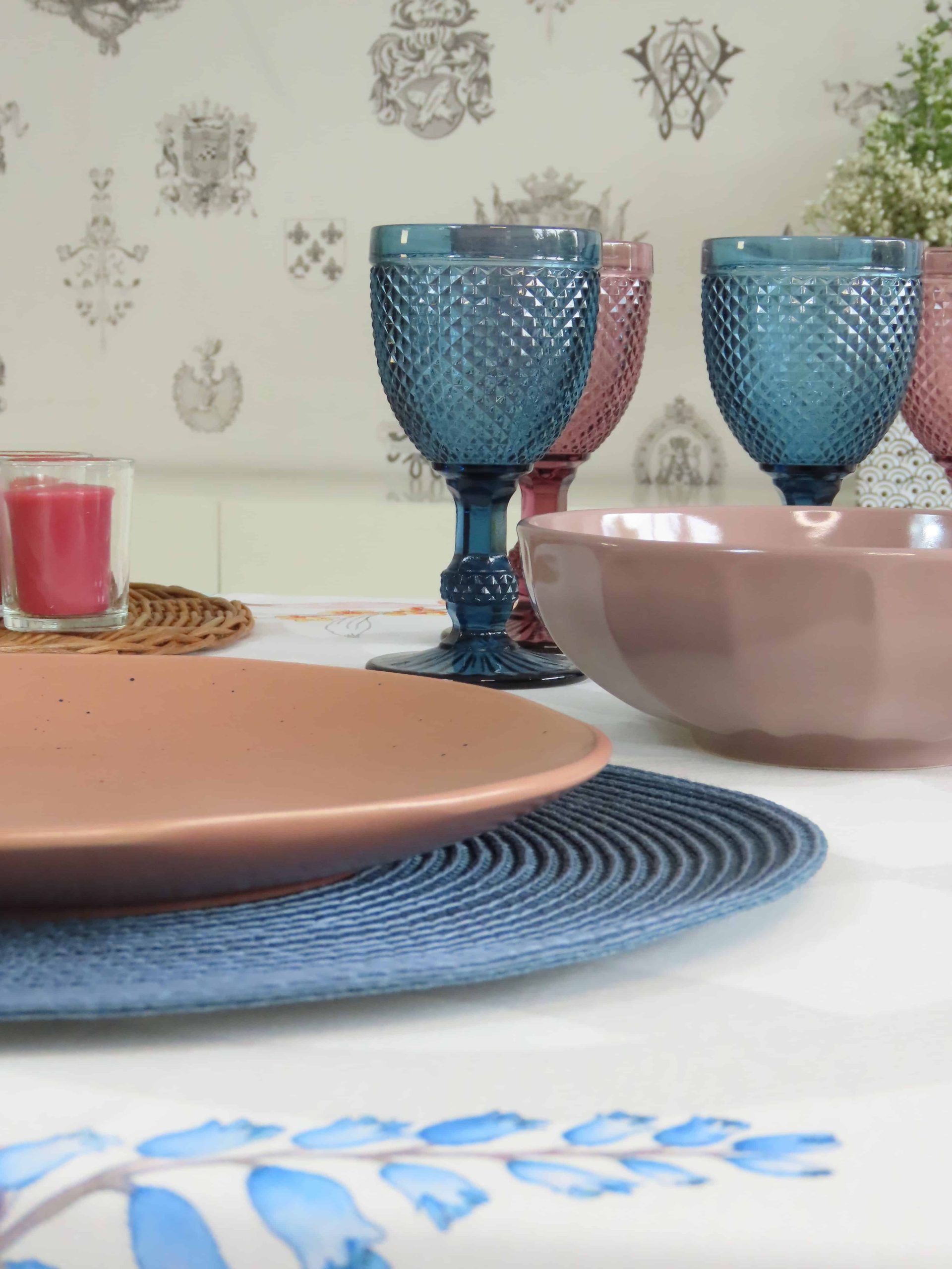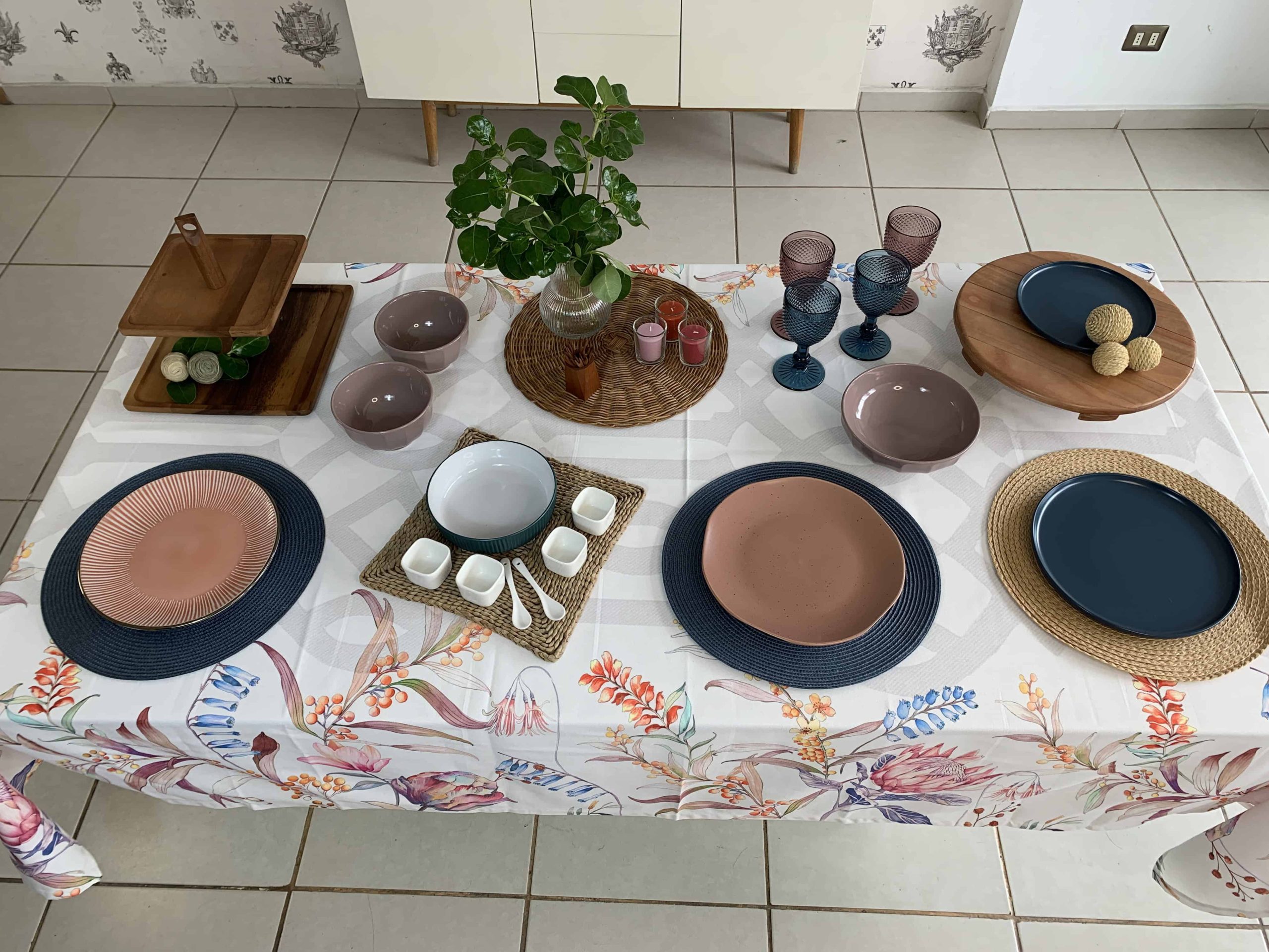 El FLORIDO estampado de este mantel llena la mesa de color y alegría. La vajilla acentúa una combinación EXQUISITA que mezcla la belleza de los tonos azules con los rosas. Cada elemento elegido acompaña el dinamismo y FRESCURA propia de las flores creando un estilo único.